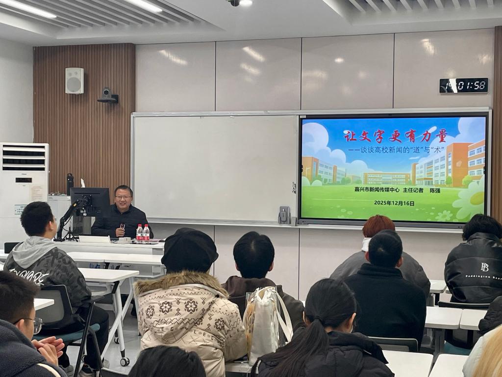 12月16日,嘉兴市新闻传媒体中心主任记者陈强应邀莅临我院,开展题为“让文字更有力量——谈谈高校新闻的‘道’与‘术’”的专题讲座。活动由训练孵化中心方凌飞老师主持,吸引了50余名对新闻写作感兴趣的师生参加。